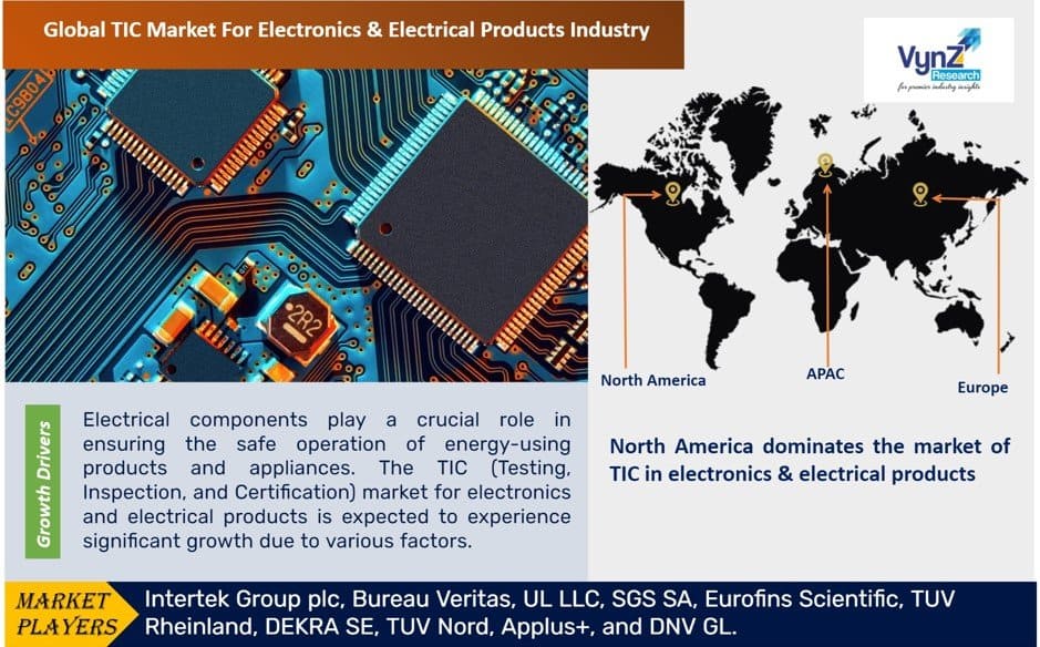 Some of the key players operating in the TIC market in the electronics & electrical products industry are Intertek Group plc, Bureau Veritas, UL LLC, SGS SA, Eurofins Scientific, TUV Rheinland, DEKRA SE, TUV Nord, Applus+, and DNV GL.