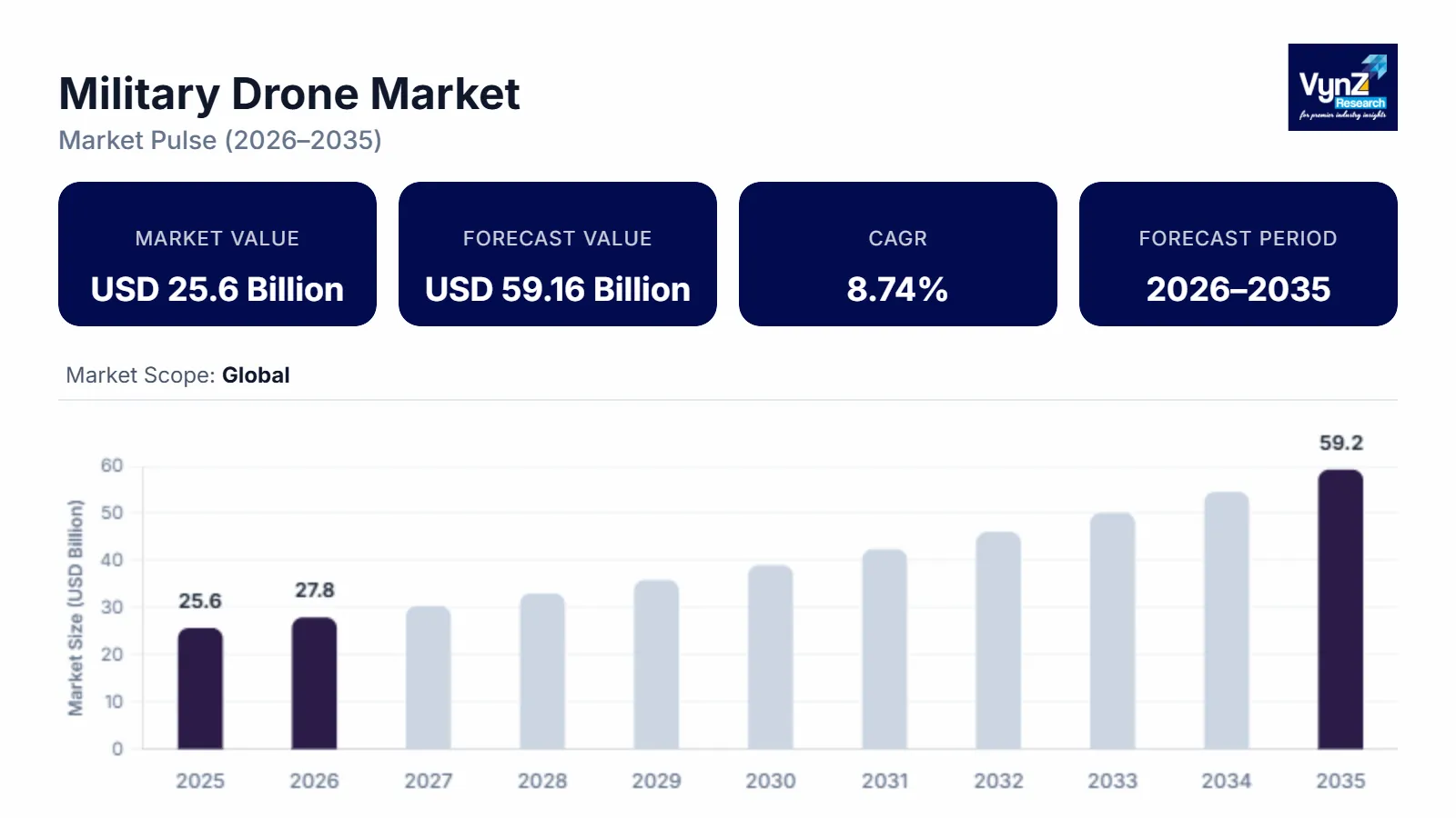 VynZ Research provides an analysis of the key trends in each segment of the Global Military Drone Market report, along with forecasts at the regional and country levels from 2026-2035. Our report has categorized the market based on type, application, range and propulsion.