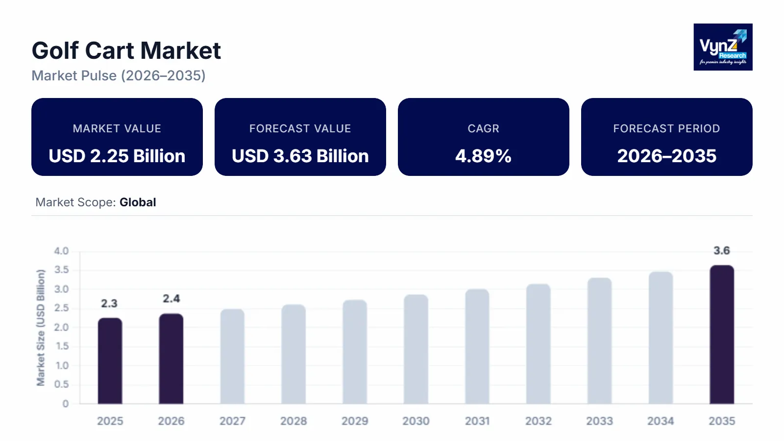 The Global Golf Cart market size was valued at USD 2.25 billion in 2025 and is estimated to reach around USD 2.36 billion in 2026. It is projected to reach approximately USD 3.63 billion by 2035, expanding at a CAGR of about 4.89% from 2026 to 2035.