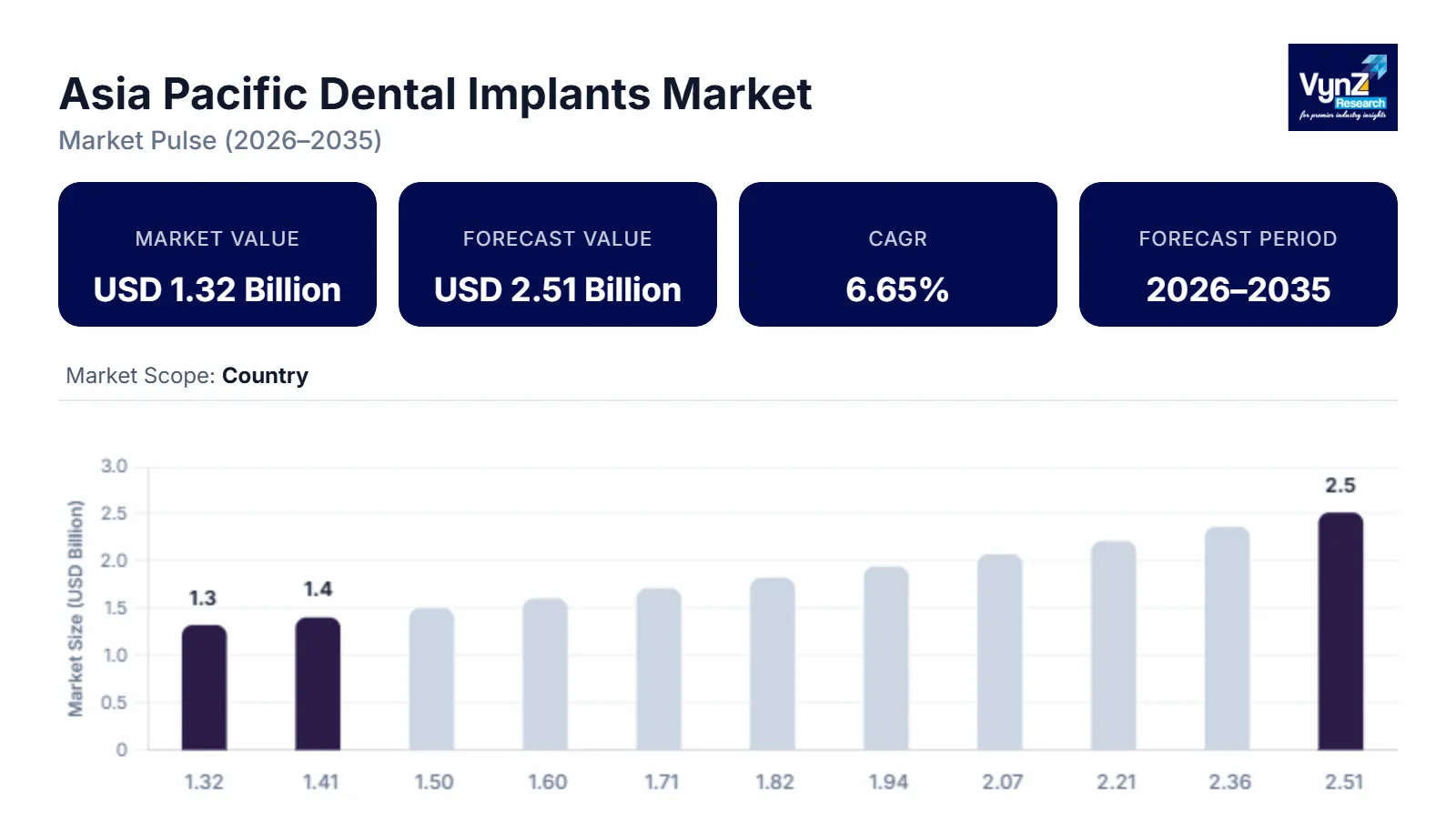 The Asia Pacific Dental Implants Market size was valued at USD 1.32 billion in 2025 and is estimated to reach around USD 1.40 billion in 2026. It is projected to reach around USD 2.51 billion by 2035, expanding at a CAGR of about 6.65 % during the forecast period from 2026 to 2035. The rise in medical tourism is one major growth driver of the market in this region, especially in countries like India, Thailand, and Singapore. It is mainly attributed to the competitive prices, high-quality dental care, advanced infrastructure, and availability of a large number of skilled professionals.