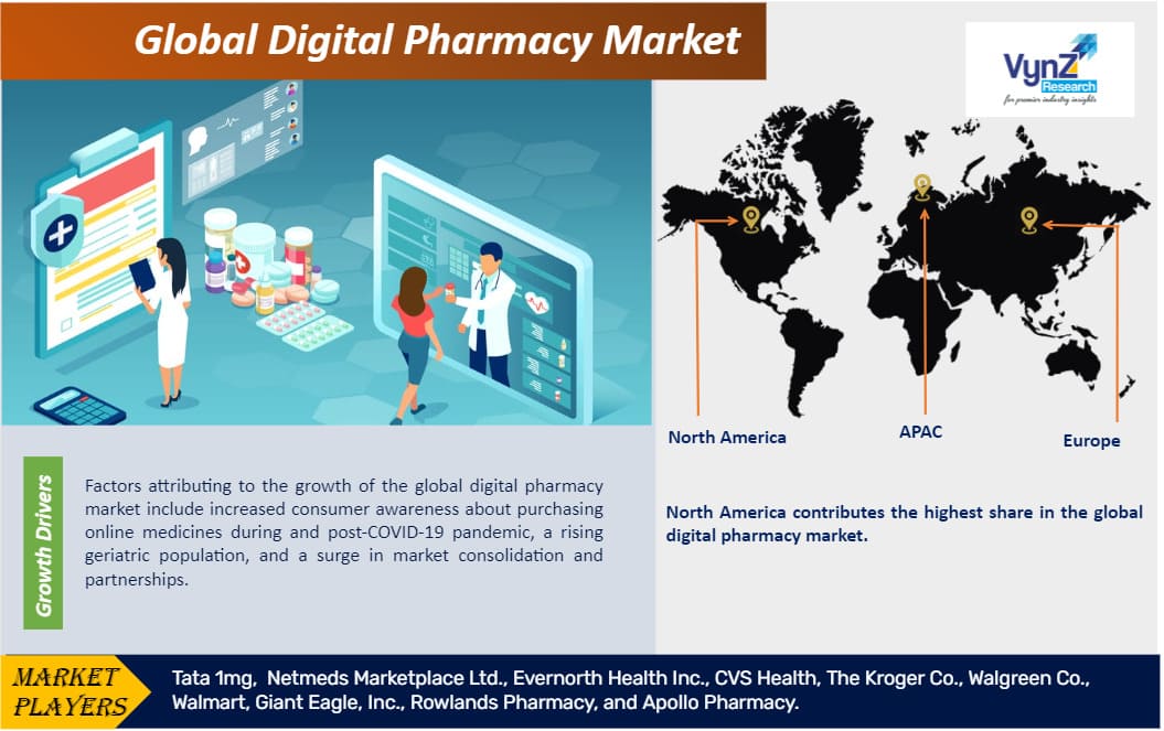 Some of the prominent players in the global digital pharmacy industry include Tata 1mg, Netmeds Marketplace Ltd., Evernorth Health Inc., CVS Health, The Kroger Co., Walgreen Co., Walmart, Giant Eagle, Inc., Rowlands Pharmacy, and Apollo Pharmacy.