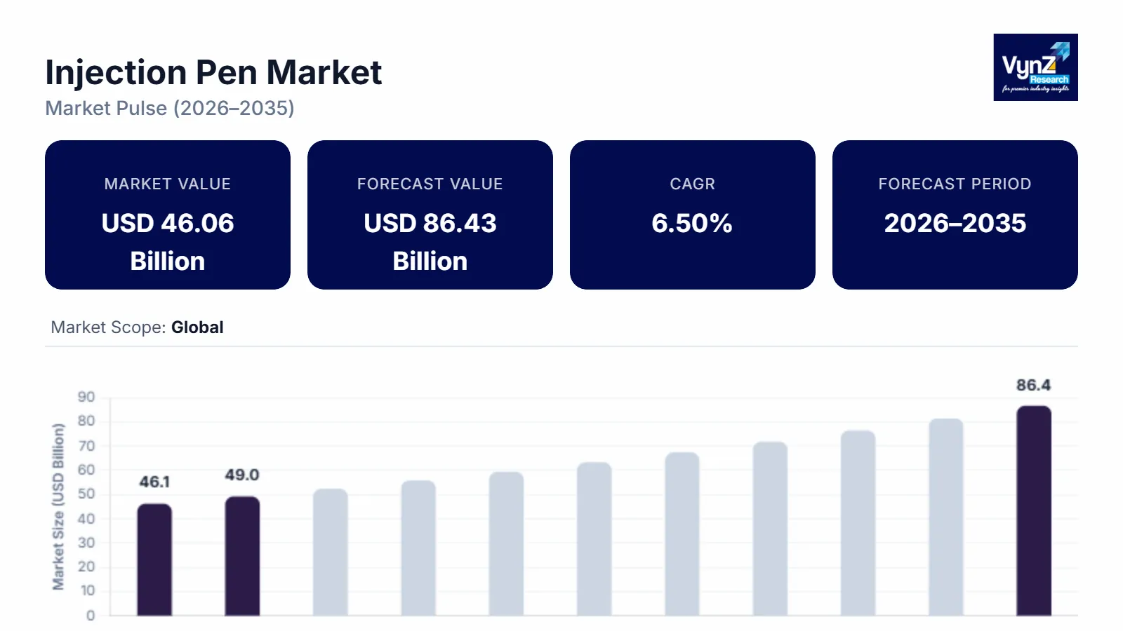 The Global Injection Pen Market size was valued at USD 46.06 billion in 2025 and is estimated to reach around USD 49.05 billion in 2026. It is projected to reach around USD 86.43 billion by 2035, expanding at a CAGR of about 6.50 % during the forecast period from 2026 to 2035.