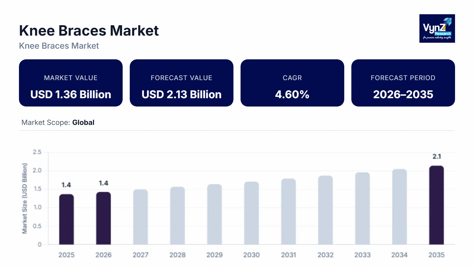 The Global Knee Braces Market was valued at USD 1.36 billion in 2025 and is estimated to reach around USD 1.42 billion in 2026. It is projected to reach around USD 2.13 billion by 2035, expanding at a CAGR of about 4.60 % during the forecast period from 2026 to 2035. The market is growing at a significant rate due to the increasing occurrence of orthopedic diseases and disorders and the expansion of the geriatric population. Different types, such as functional knee braces, prophylactic knee braces, unloader knee braces, and rehabilitative knee braces, contributed to the knee braces market size. The market has witnessed continuous demand for functional knee braces in the coming years due to enhance knee stability and function offered by functional knee braces.