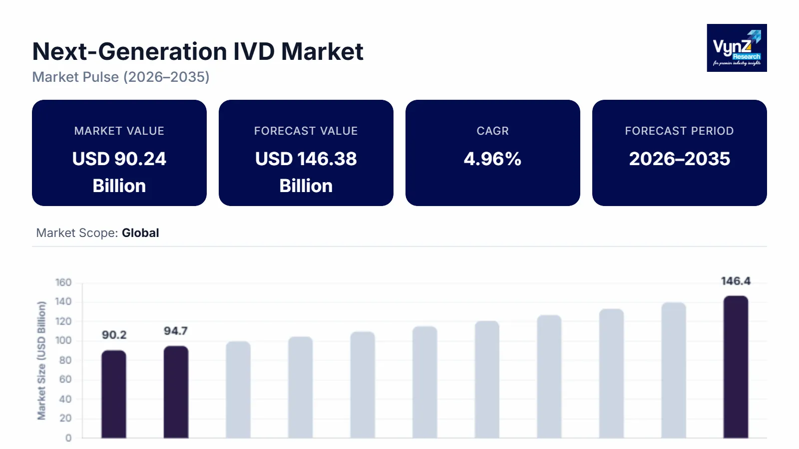 The global next-generation IVD market was valued at USD 90.24 billion in 2025 and is estimated to reach USD 94.71 billion in 2026. It is projected to reach approximately USD 146.38 billion by 2035, expanding at a CAGR of about 4.96% from 2026 to 2035. The growing demand for next-generation IVD is driven by advancements in genomics and molecular diagnostics, the rise of personalized medicine, a focus on early disease detection, and the adoption of digital health technologies for more precise and efficient diagnostics.