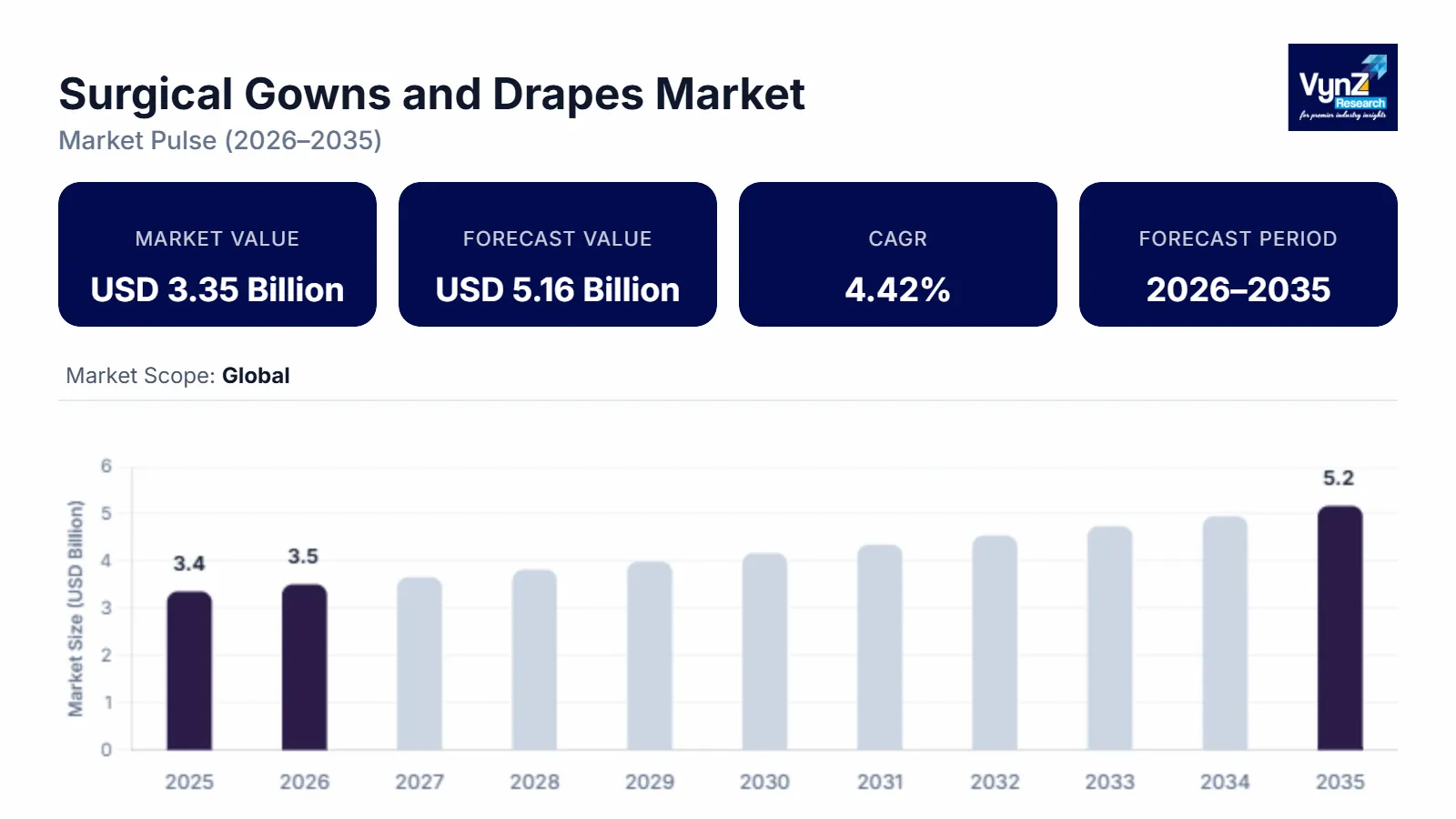 The Surgical Gown and Drape Market is expected to grow significantly between 2026 and 2035. The market, valued at USD 3.35 billion in 2025 and estimated to reach around USD 3.50 billion in 2026, is projected to reach around USD 5.16 billion by 2035, expanding at a CAGR of about 4.42 % during the forecast period from 2026 to 2035.