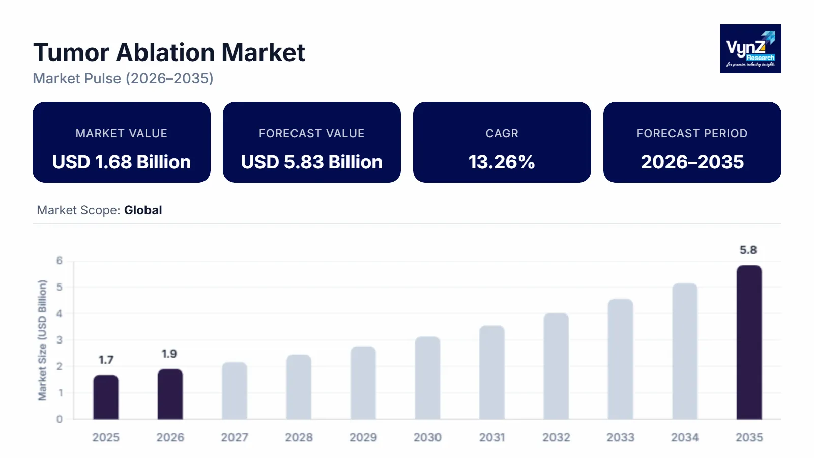 The Global Tumor Ablation Market, valued at USD 1.68 billion in 2025 and estimated to reach around USD 1.90 billion in 2026, is projected to reach around USD 5.83 billion by 2035, expanding at a CAGR of about 13.26 % during the forecast period from 2026 to 2035.