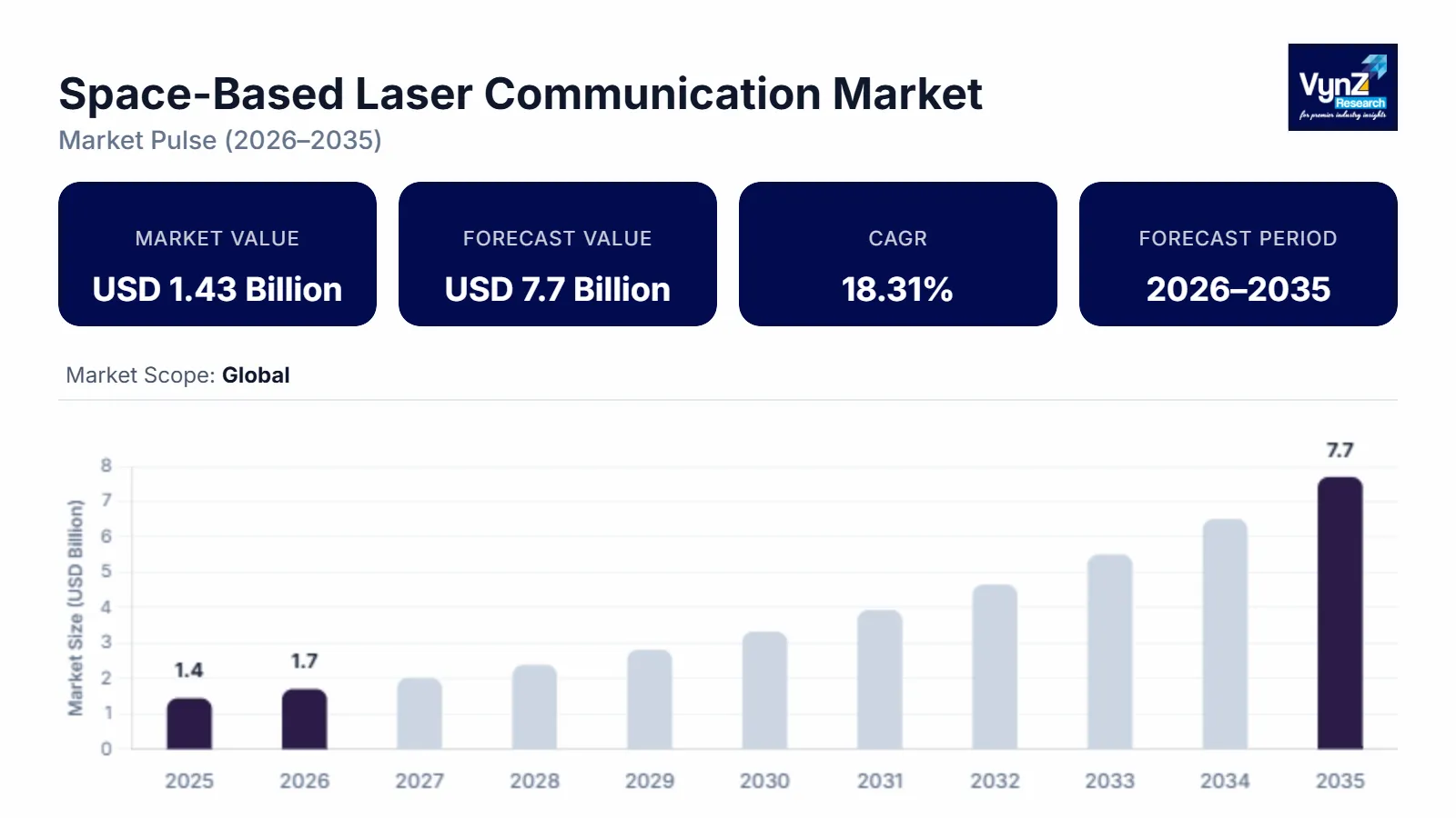 The Global Space-Based Laser Communication Market size was valued at USD 1.43 billion in 2025 and is estimated to reach around USD 1.69 billion in 2026. It is projected to reach around USD 7.7 billion by 2035, expanding at a CAGR of about 18.31% from 2026 to 2035.