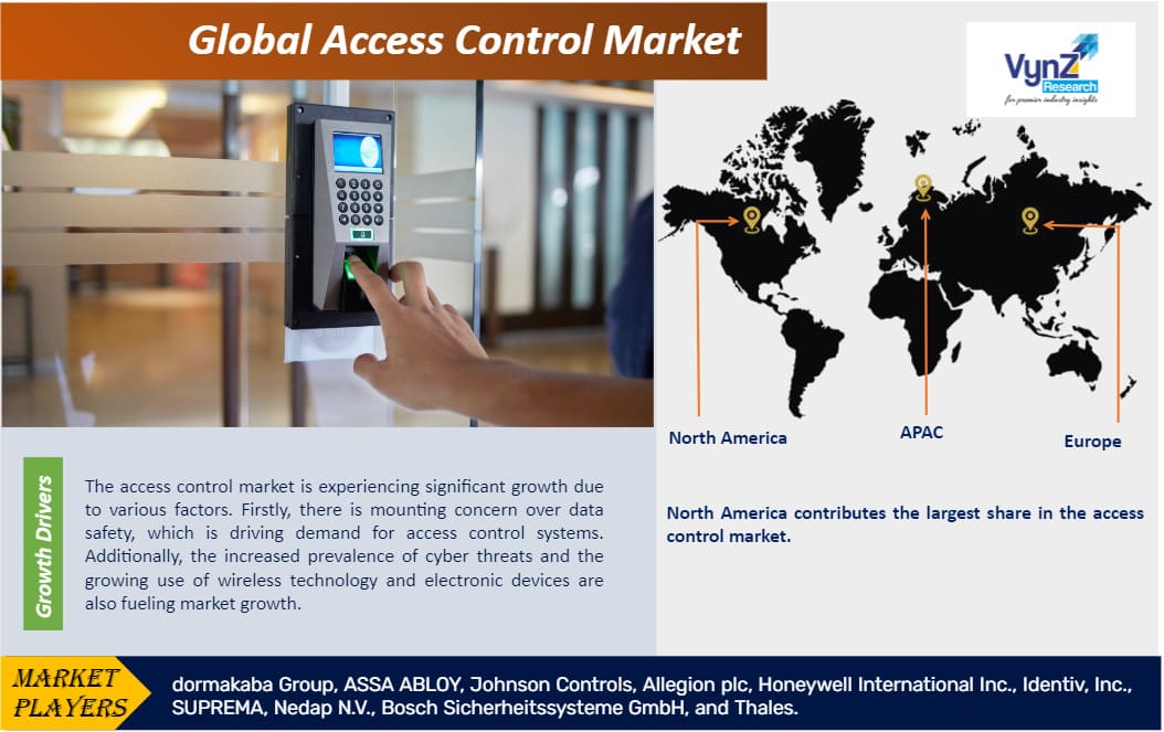 Some of the industry players in the global access control market include dormakaba Group, ASSA ABLOY, Johnson Controls, Allegion plc, Honeywell International Inc., Identiv, Inc., SUPREMA, Nedap N.V., Bosch Sicherheitssysteme GmbH, and Thales.